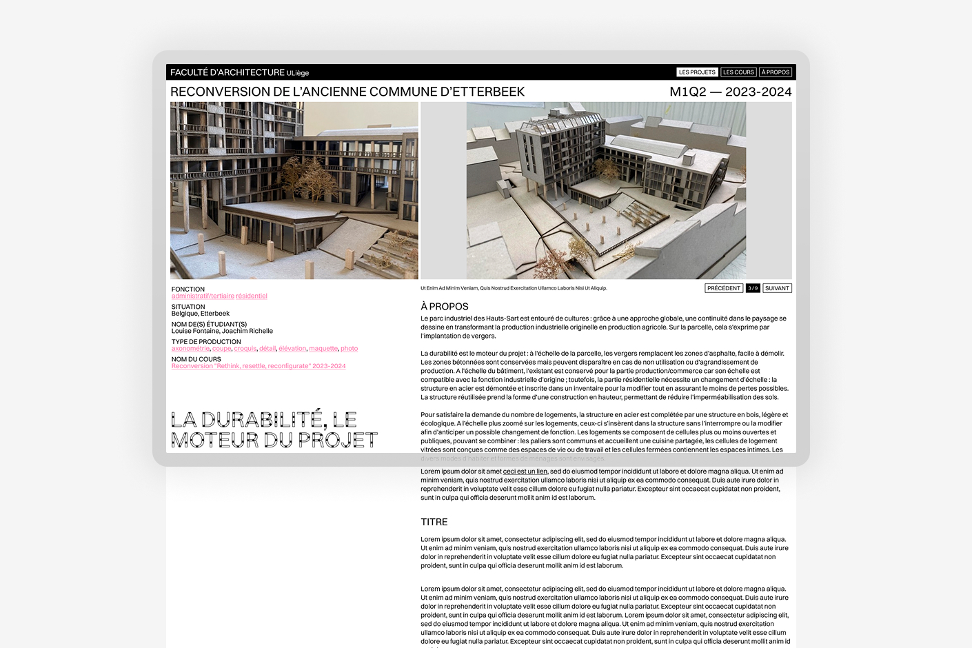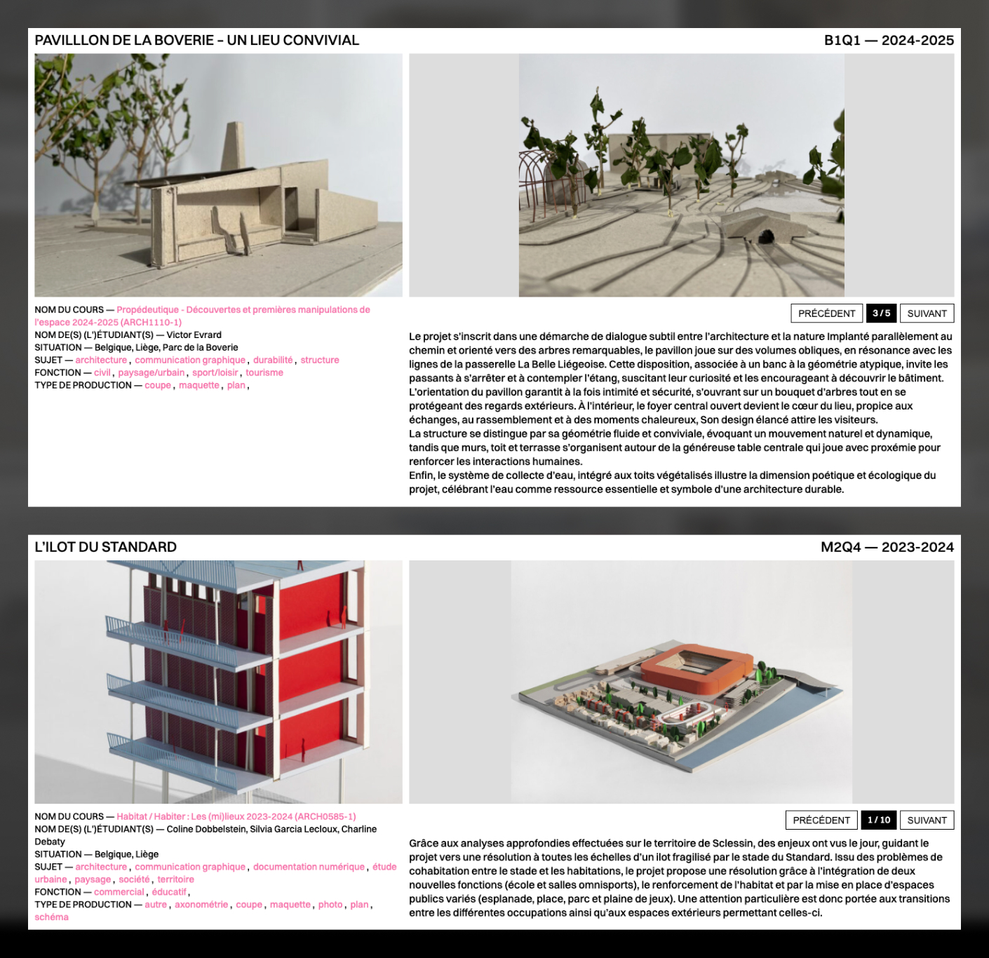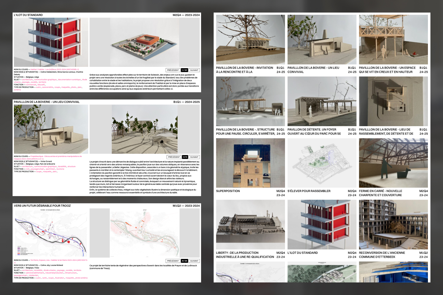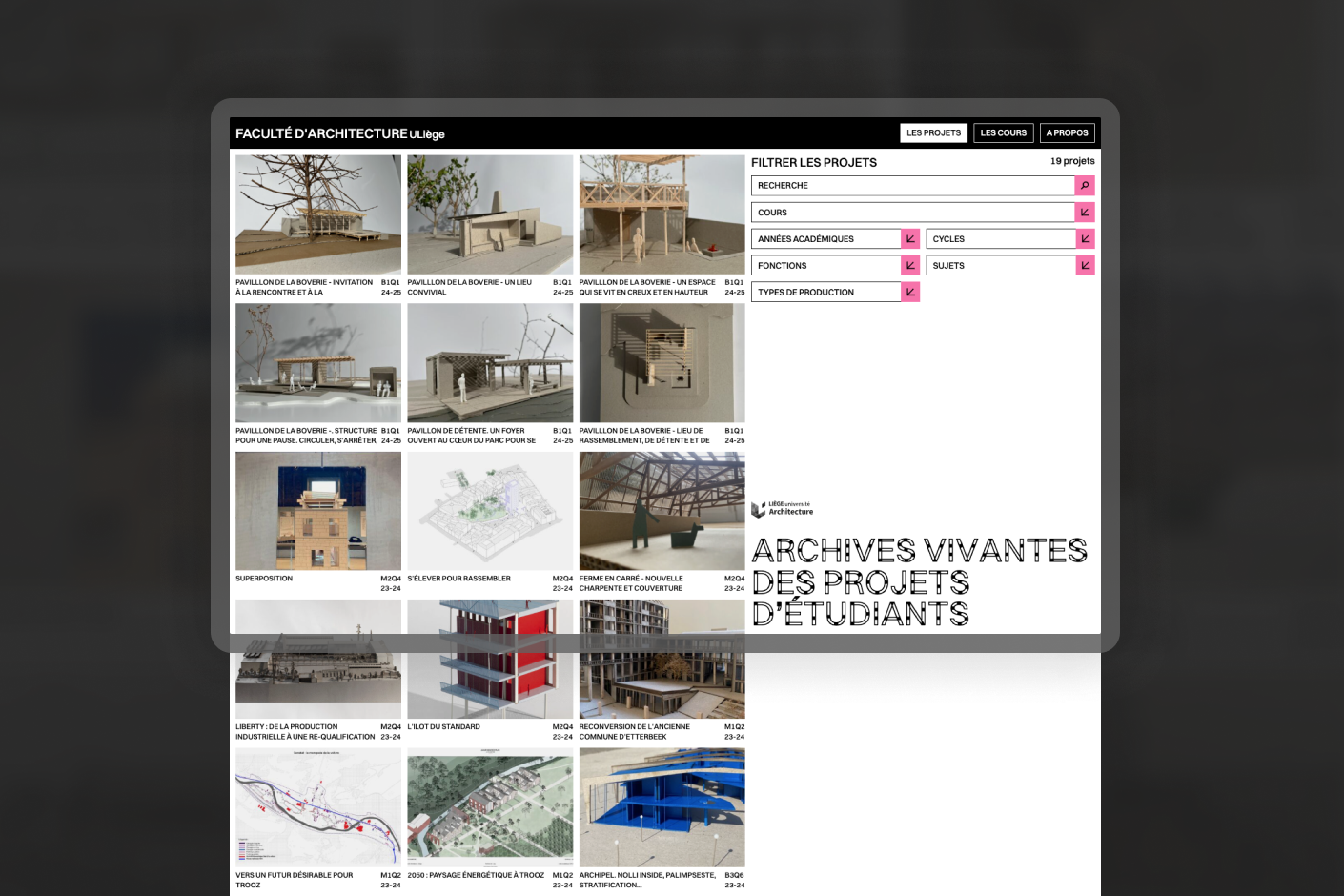 La Faculté d’Architecture de l’ULiège permet désormais aux étudiants de publier, eux-mêmes, leur projets scolaires sur une plateforme publique en ligne. Cet exercice autocentré projette l’étudiant dans son avenir professionnel et dans la tenue d’un portfolio dans lequel il apprend à communiquer et argumenter sur ses réalisations.