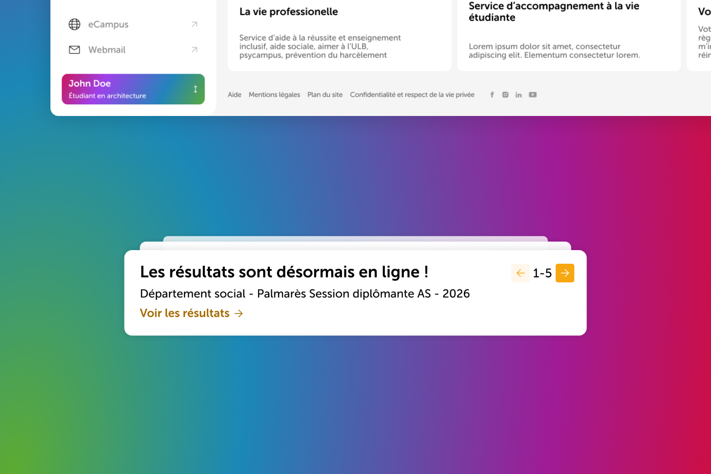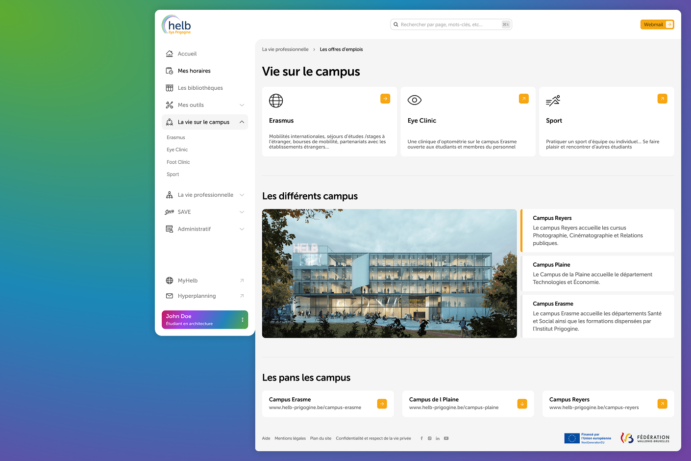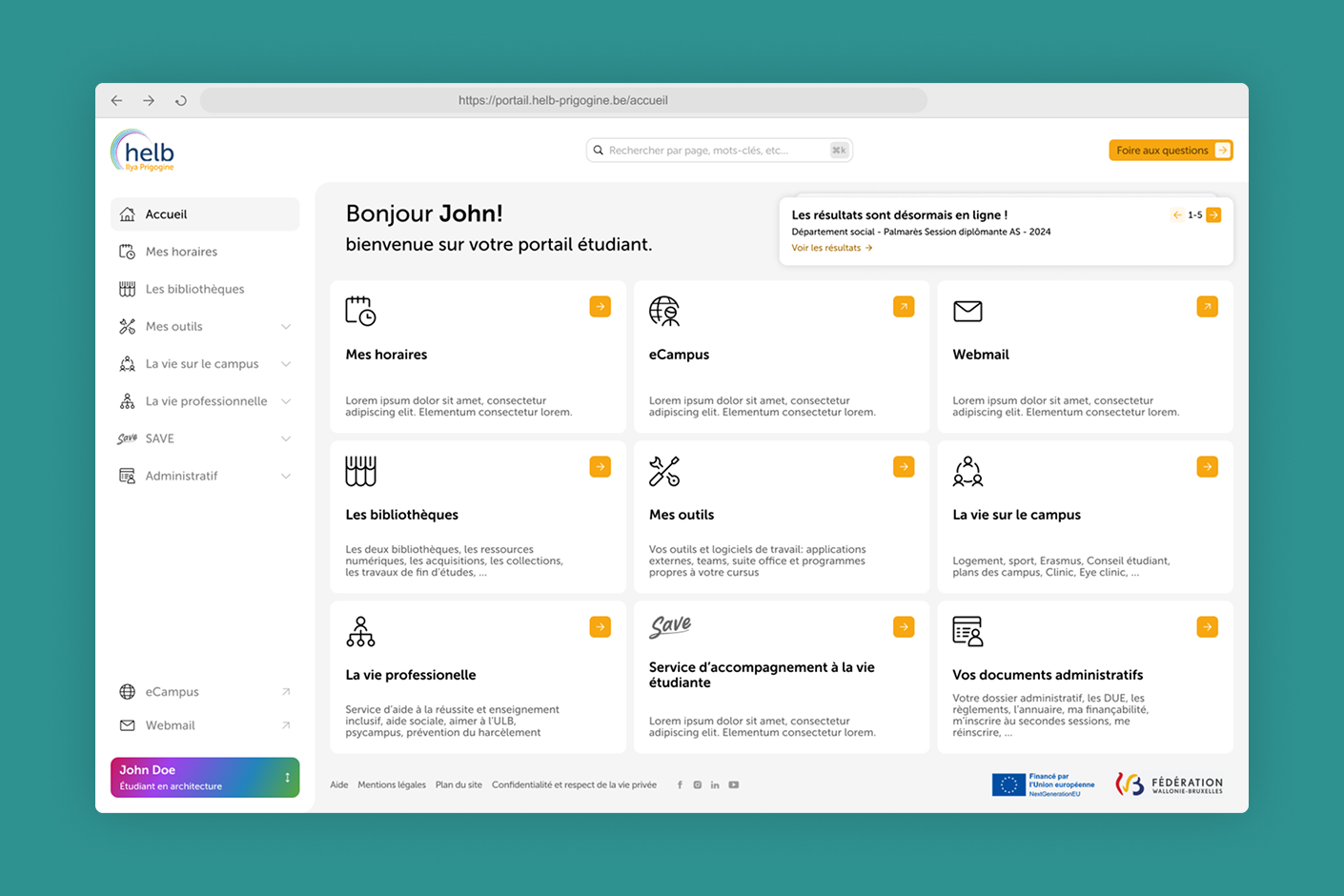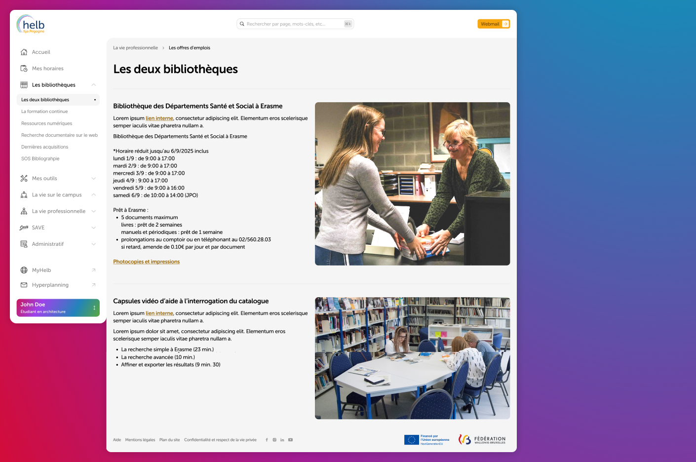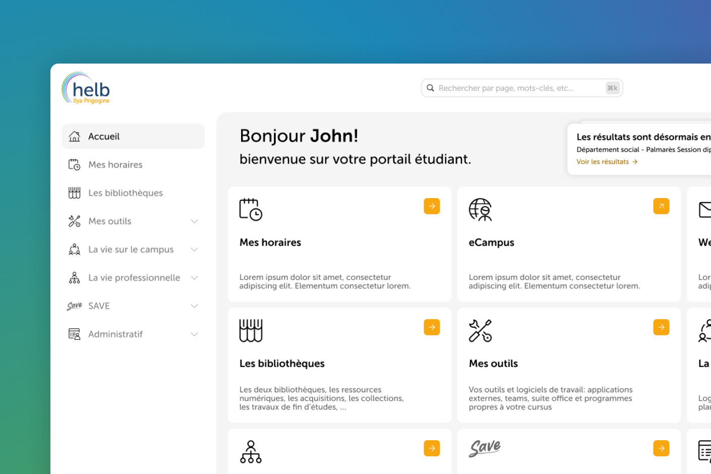 Le Portail des étudiants et des professeurs de la Haute École Libre de Bruxelles a fait l’objet d’une refonte complète. Celle-ci nous a été confiée dans son ensemble: réorganisation structurelle des pages et sous-pages, navigation fluide à travers celles-ci, redesign complet de l’interface et développement sur mesure de la solution.