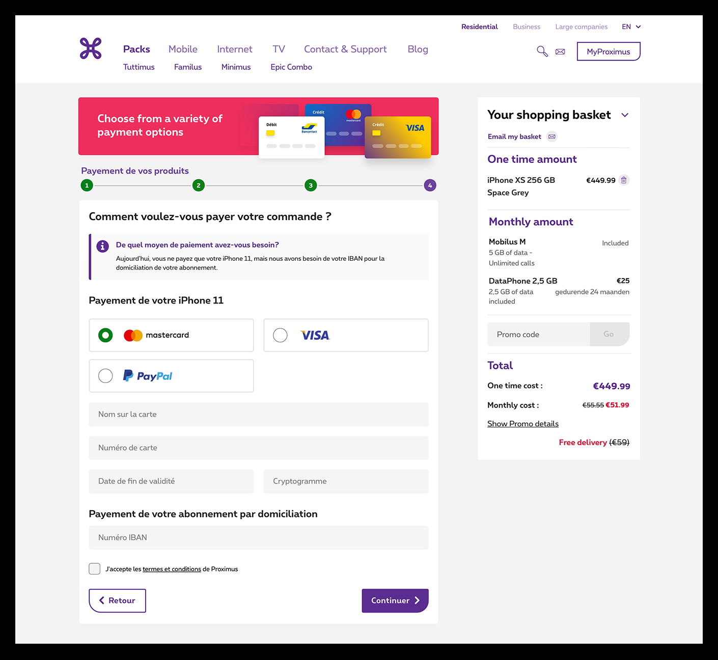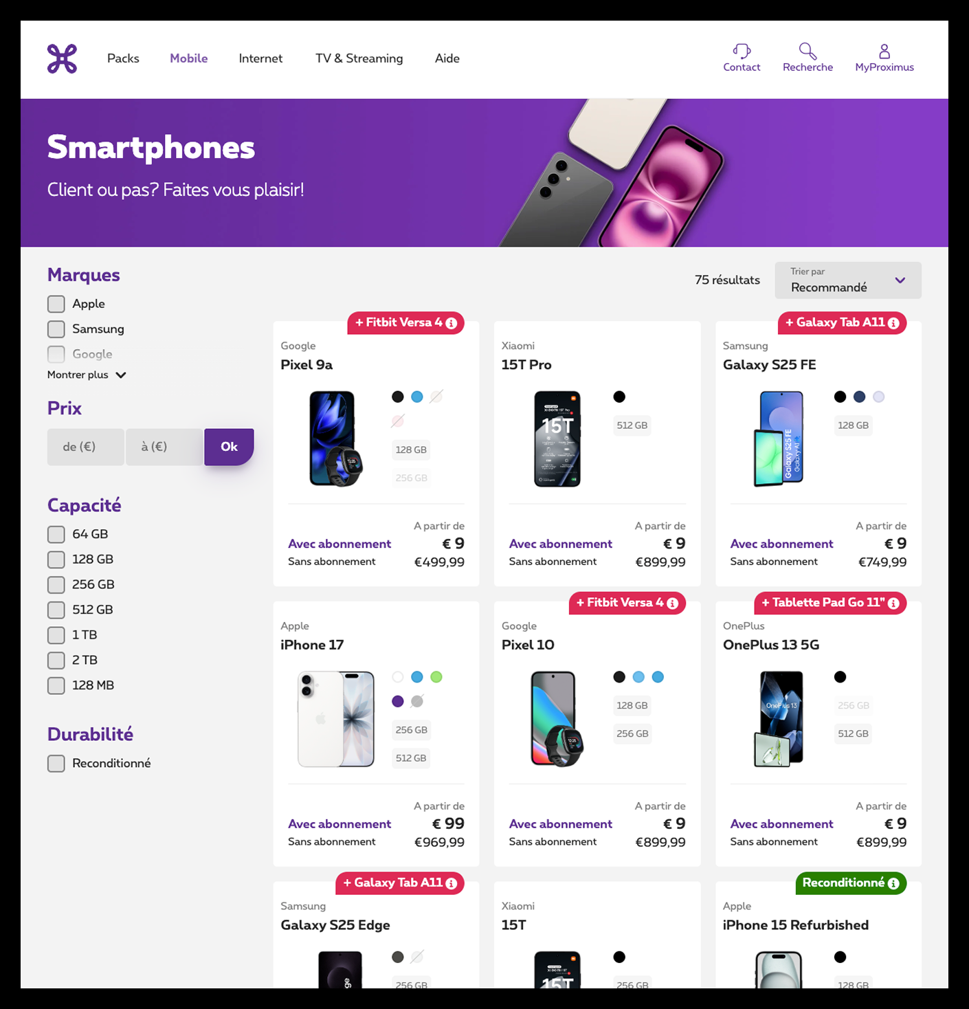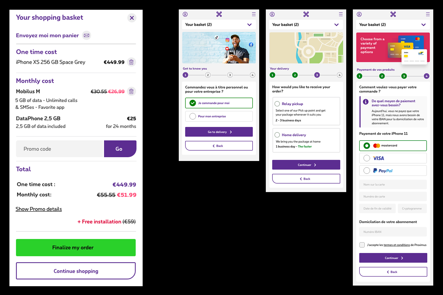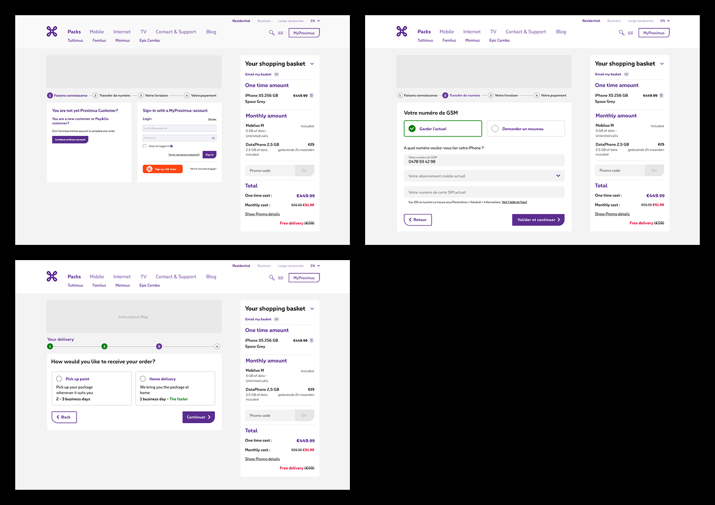 La boutique en ligne de Proximus propose de nombreux produits liés au monde des télécommunications. Dans le cadre de sa refonte, nous avons réalisé une analyse de l’expérience utilisateur basée sur l’étude des résultats d’analyse de trafic. Par la suite, nous avons proposé des wireframes d’un nouveau tunnel de commande, que nous avons testés sur un échantillon d’utilisateurs. Ces tests nous ont permis d’établir un rapport d’analyse de leurs comportements et d’en tirer une série de conclusions. Celles-ci ont été prises en compte et se reflètent dans les dernières propositions d’interfaces, aujourd’hui intégrées au webshop en ligne.
