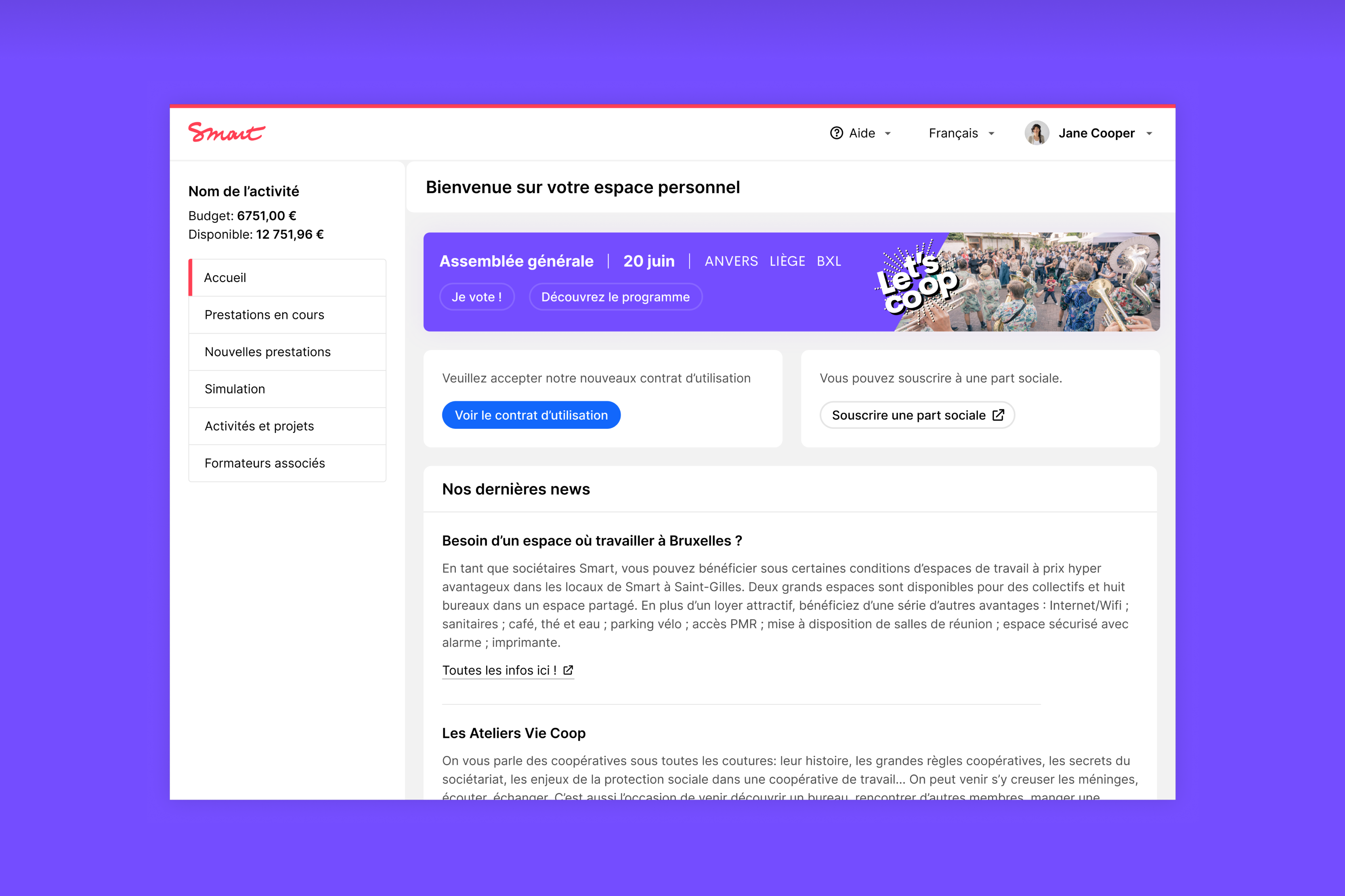 Smart est une coopérative de travailleurs et travailleuses qui permet d’héberger leurs projets professionnels, de partager des moyens, des outils et des garanties pour développer leurs activités en toute sérénité. Pour ceci, l’expérience de ses 30.000 membres sur ses outils informatiques à été révisée. Nous avons pris le Lead sur les objectifs et les moyens déployés pour s’assurer que toute personne (membre ou interne) puisse travailler et profiter des outils pleinements.